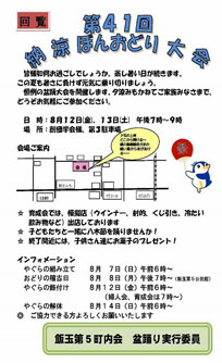 ・日々大変暑くなってきましたが、皆さんお元気でしょうか? 飯玉第五町内では昨年に続き今年も8月9日(土)『納涼盆踊り大会』を実施します。皆さん、ふるってご参加ください。