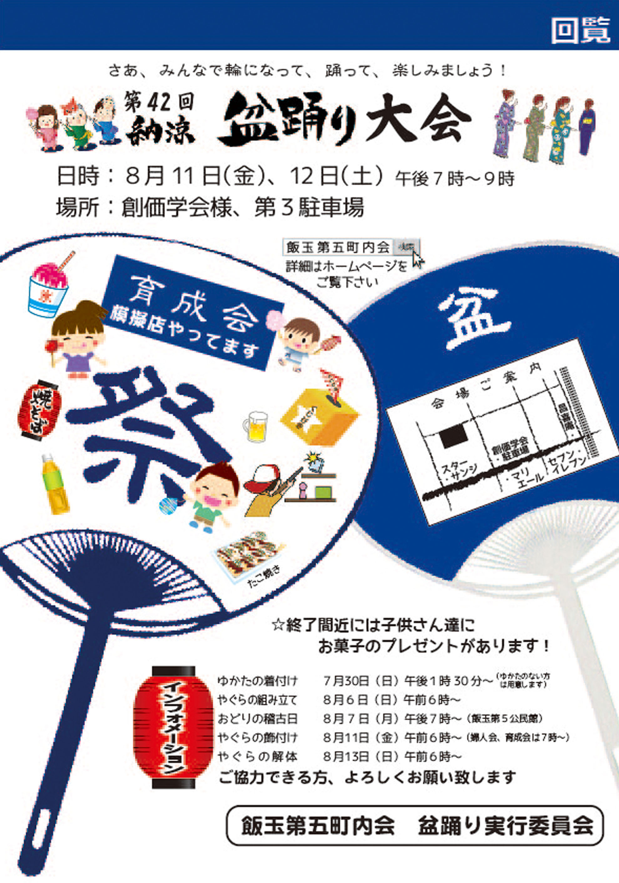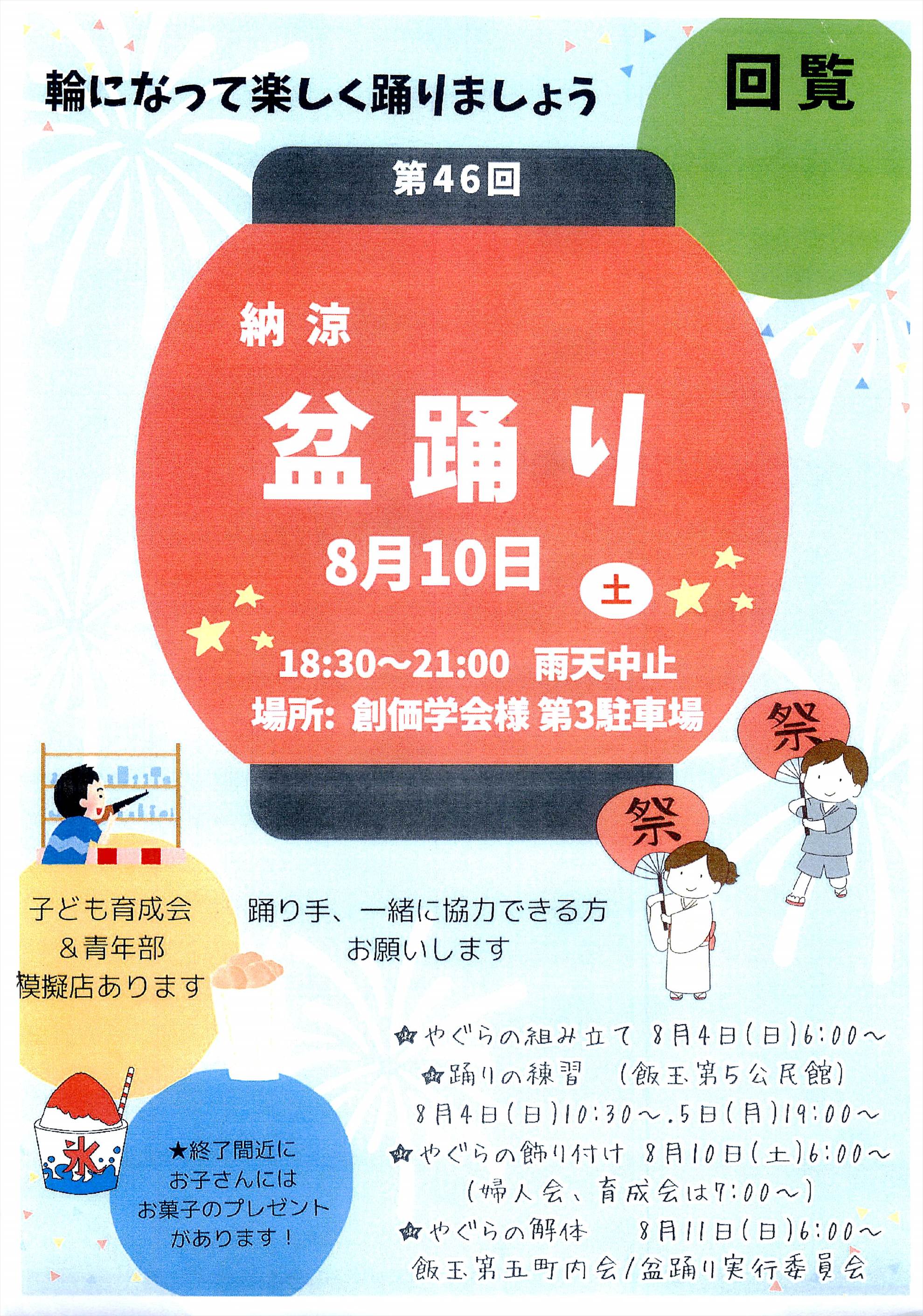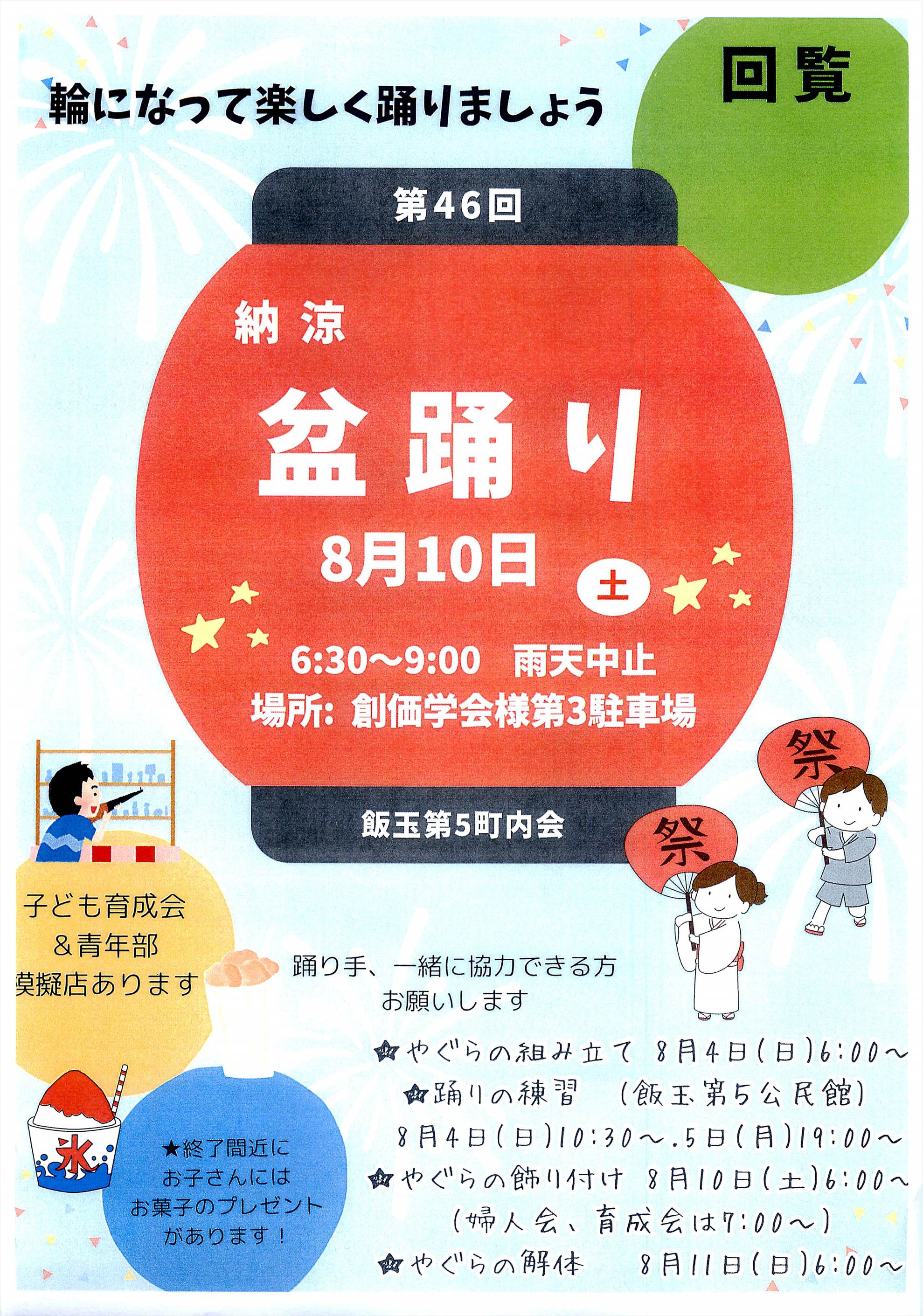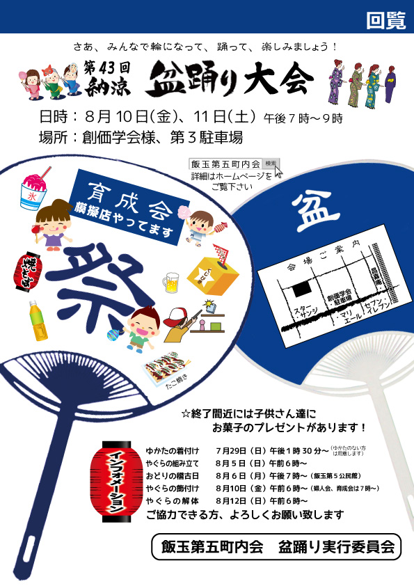 ・飯玉第五町内では昨年に続き今年も8月9日(土)『納涼盆踊り大会』を実施します。場所が変更なりましたのでご注意ください。皆さん、ふるってご参加ください。