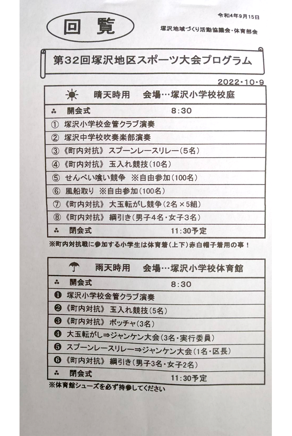 ☆10月9日 塚沢スポーツ大会のプログラムができました