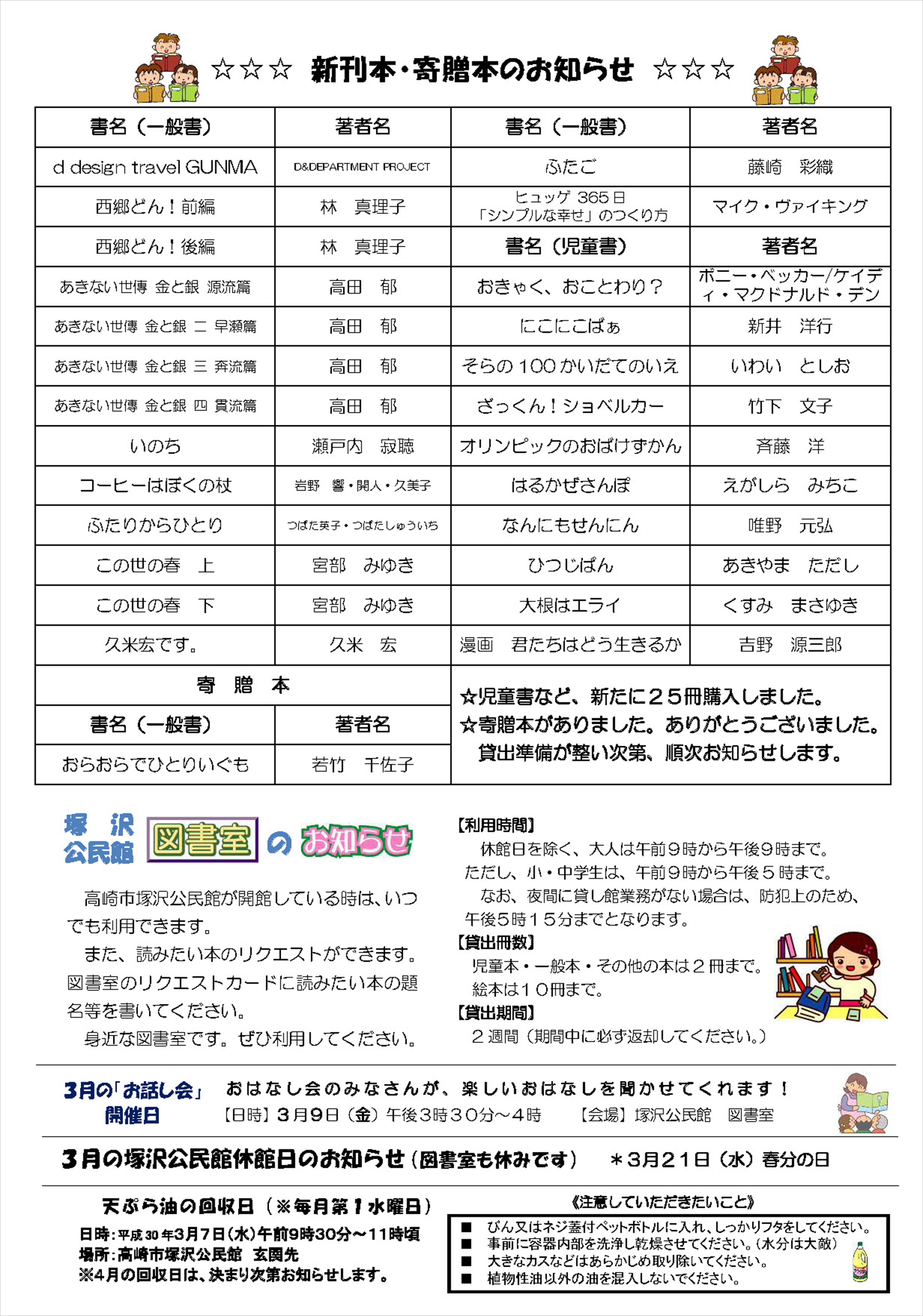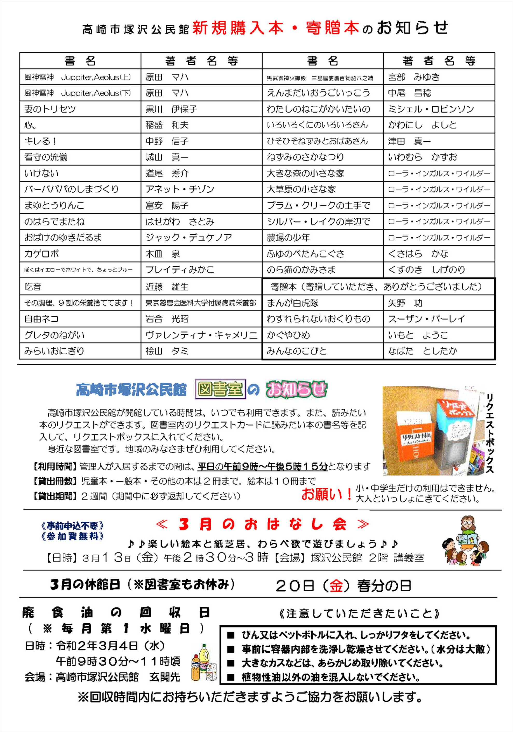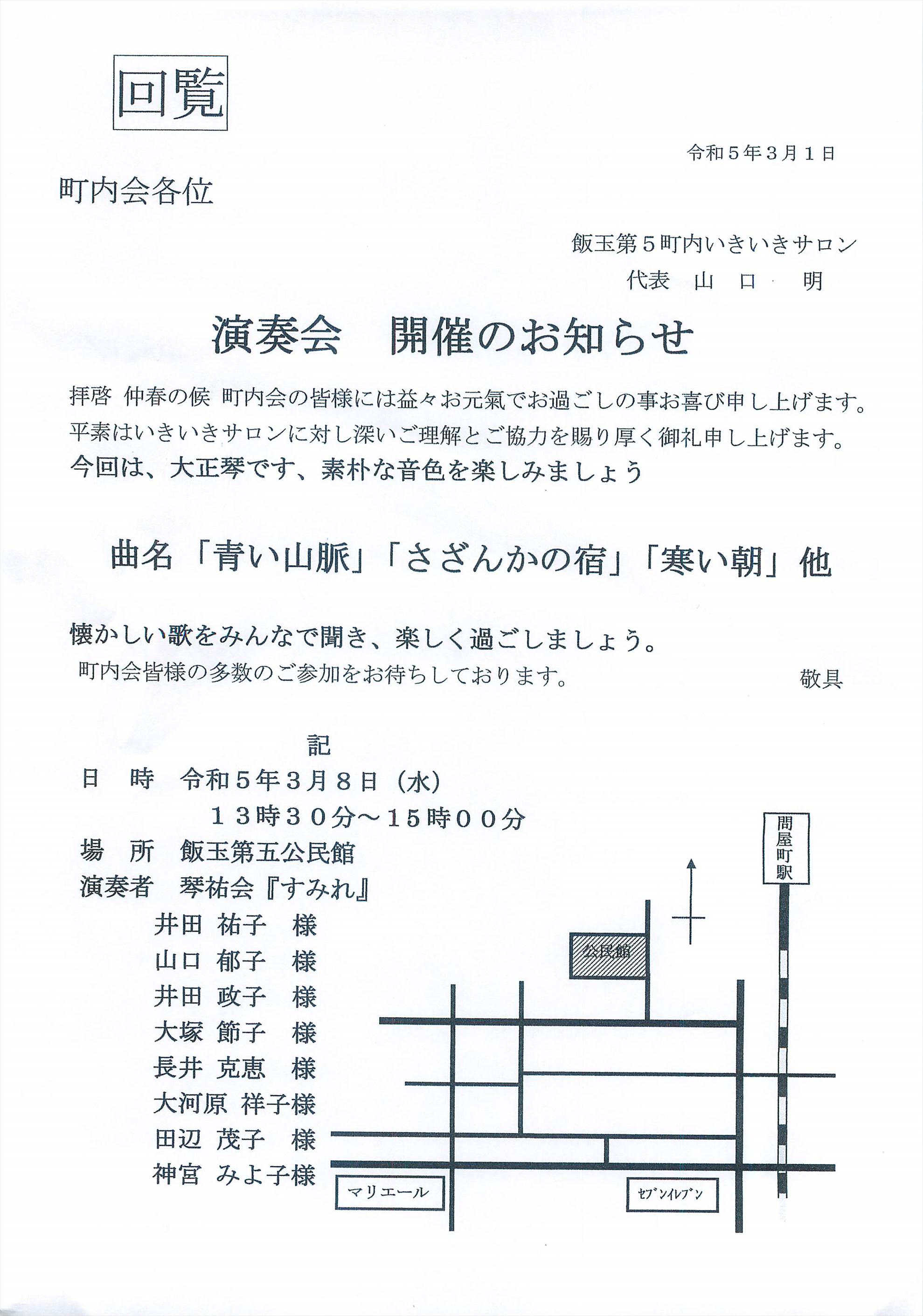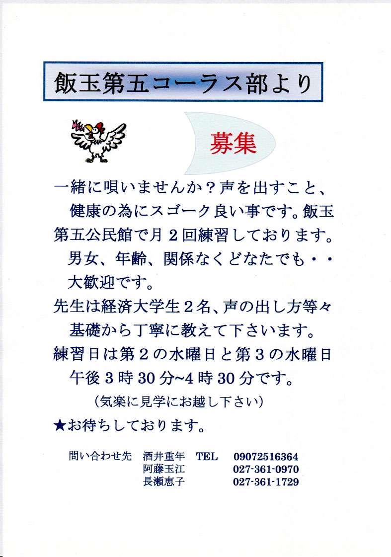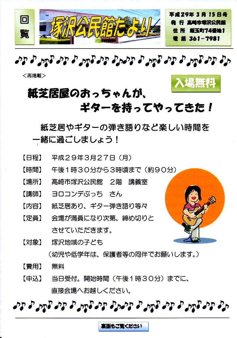 飯玉第5町内会の回覧板と掲示板(3/15版)をアップしました。「飯玉第五コーラス部」の募集や、塚沢公民館で3月27日に行われる『紙芝居のおっちゃんがギターを持ってやってきた!』等のご案内があります。