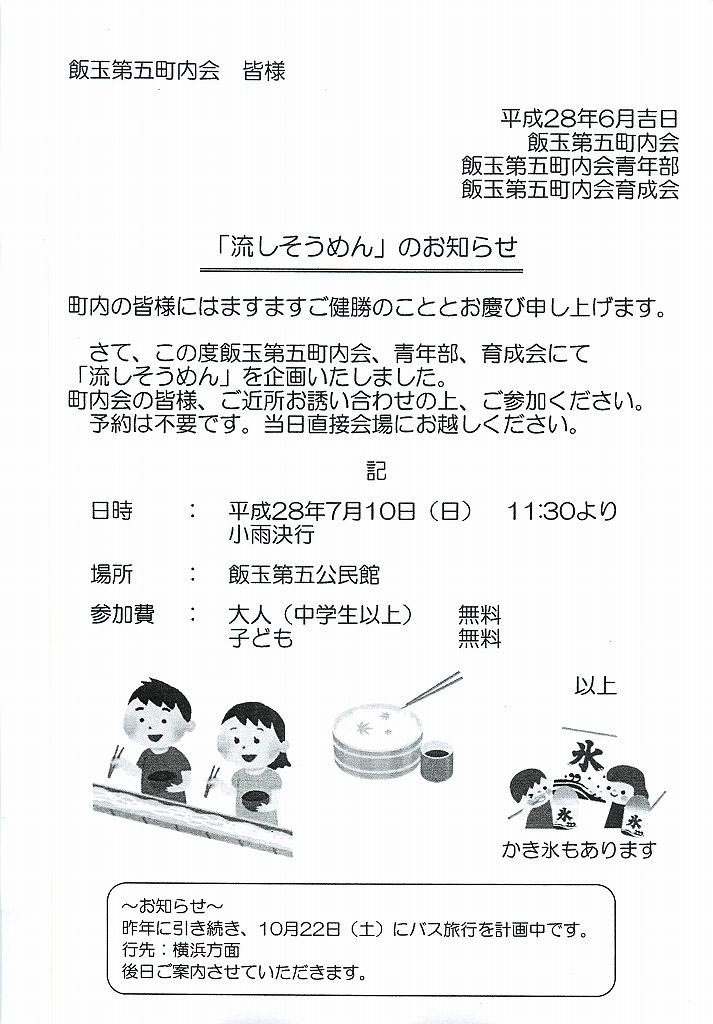 「流しそうめん」(町内会・青年部・育成会主催)を7月10日(日)飯玉第五公民館11時30分から参加費無料。詳細はこちら。