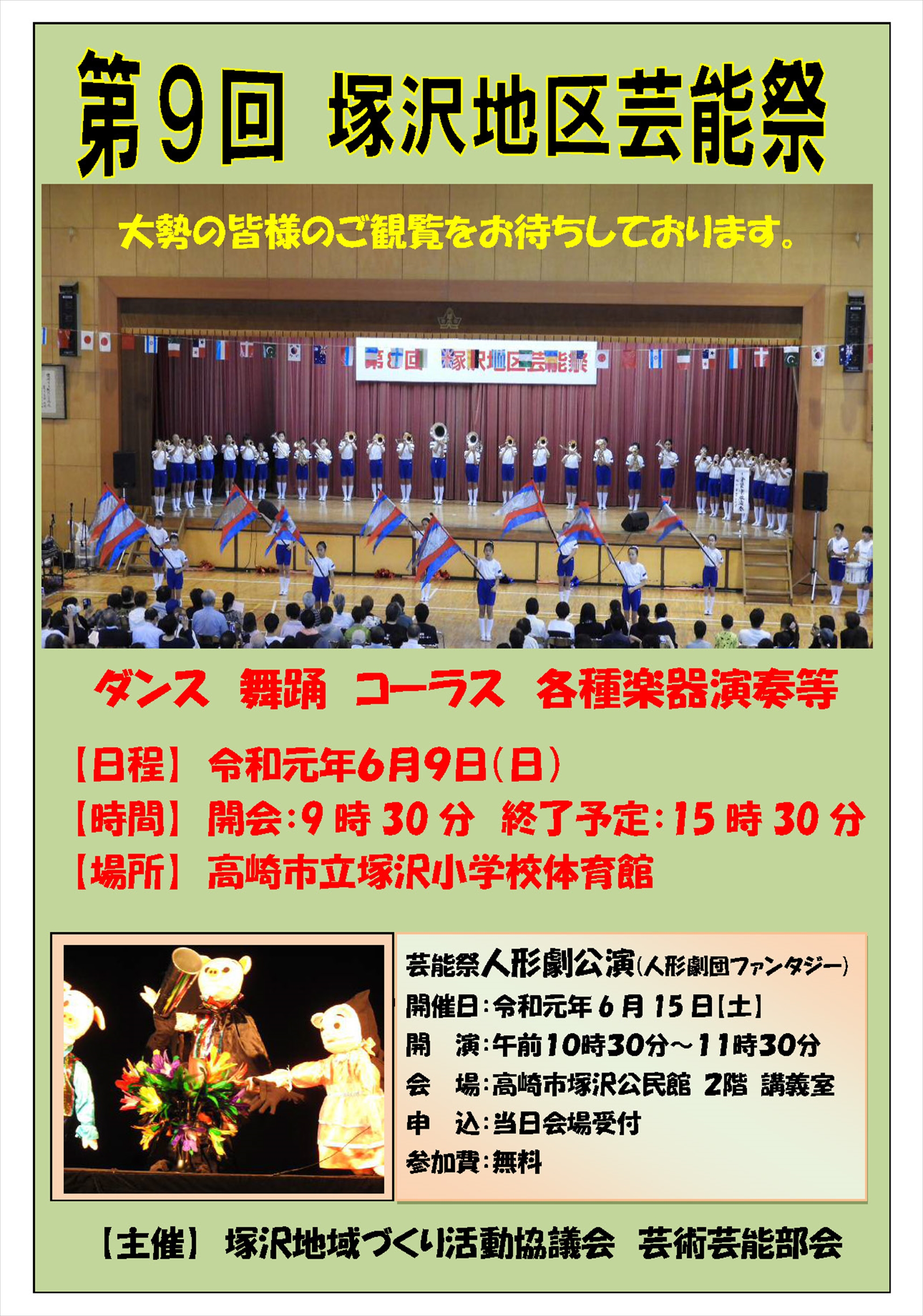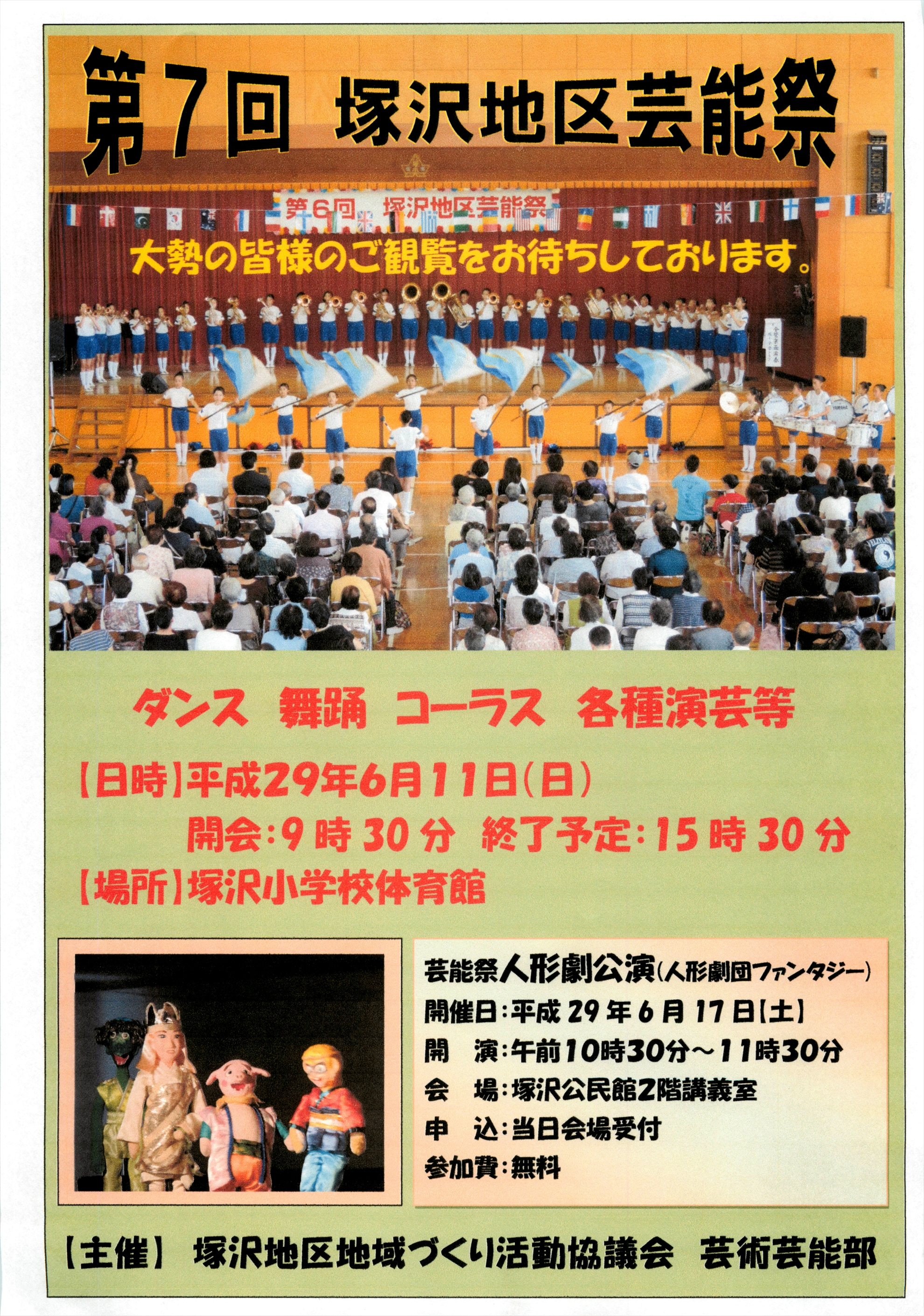・6月11日(日)に塚沢小学校体育館にて「第7回塚沢地区芸能祭」が行われます。大勢の皆様のご観覧をお待ちしております。