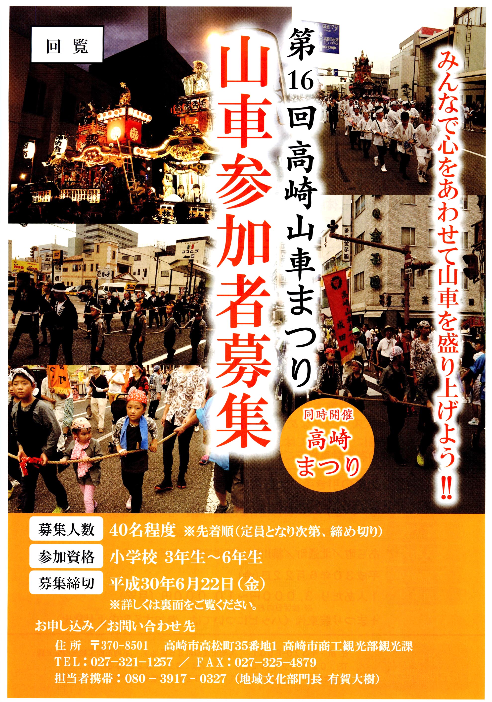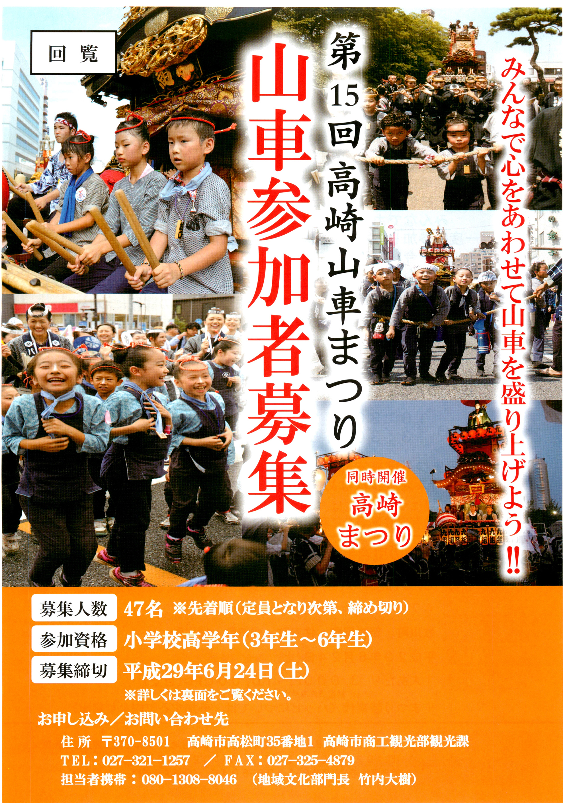 ・第15回高崎山車まつりの参加者を高崎市商工観光部観光課で募集しております。