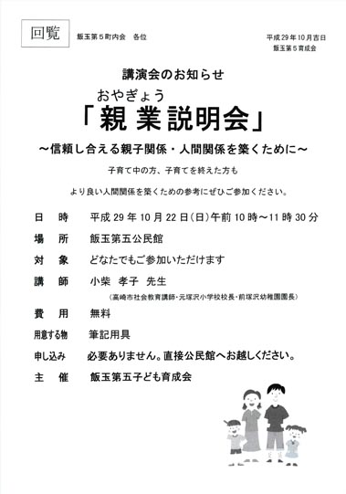 ・5月29日に塚沢公民館にて元塚沢小学校校長・全塚沢幼稚園園長の小柴孝子さんが講師で「より良い人間関係のつくりかた」の講演があります。