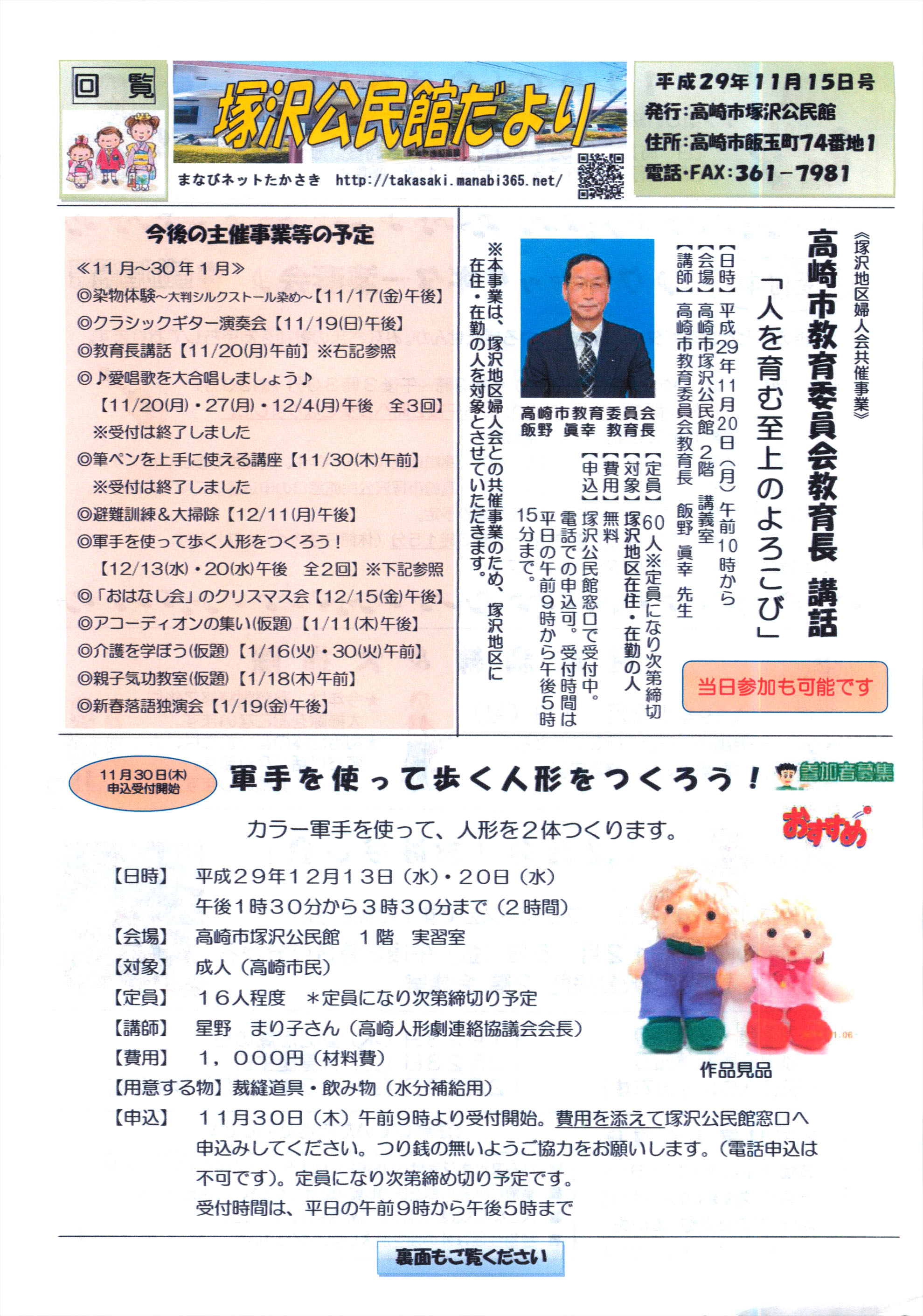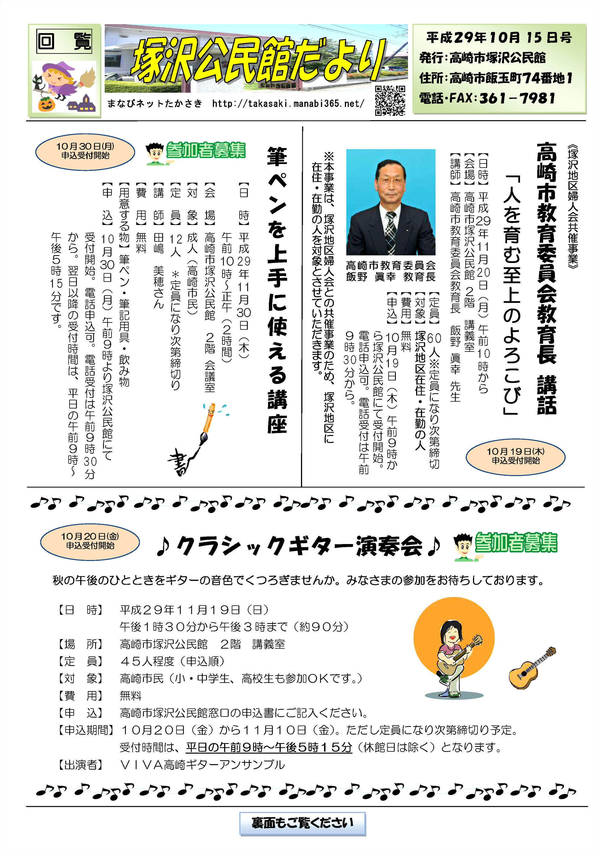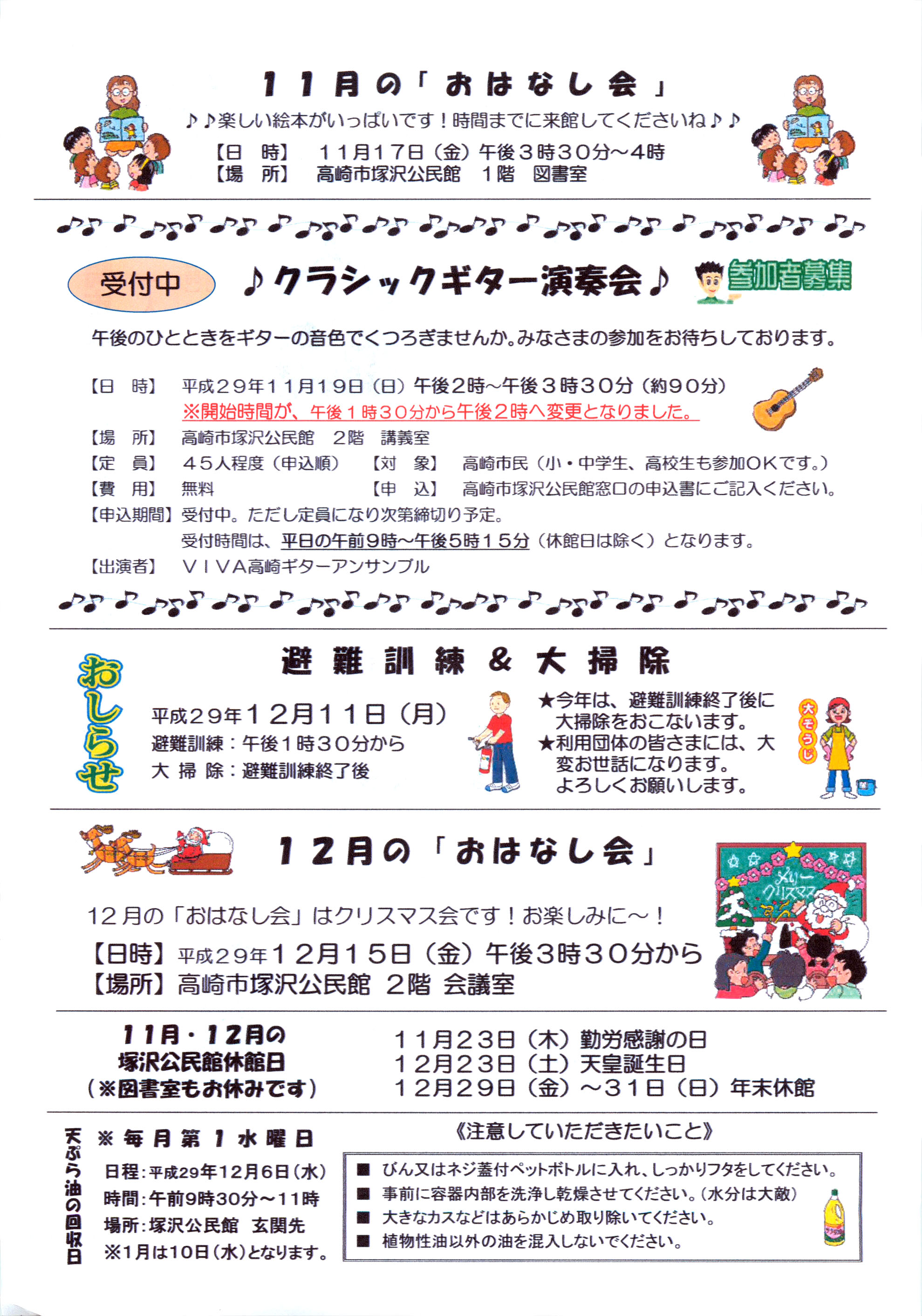 ☆11月1日 「塚沢公民館だより」(「魔法の麺つゆづくり教室」や「クラシックギター演奏会」が12月にあるそうです)