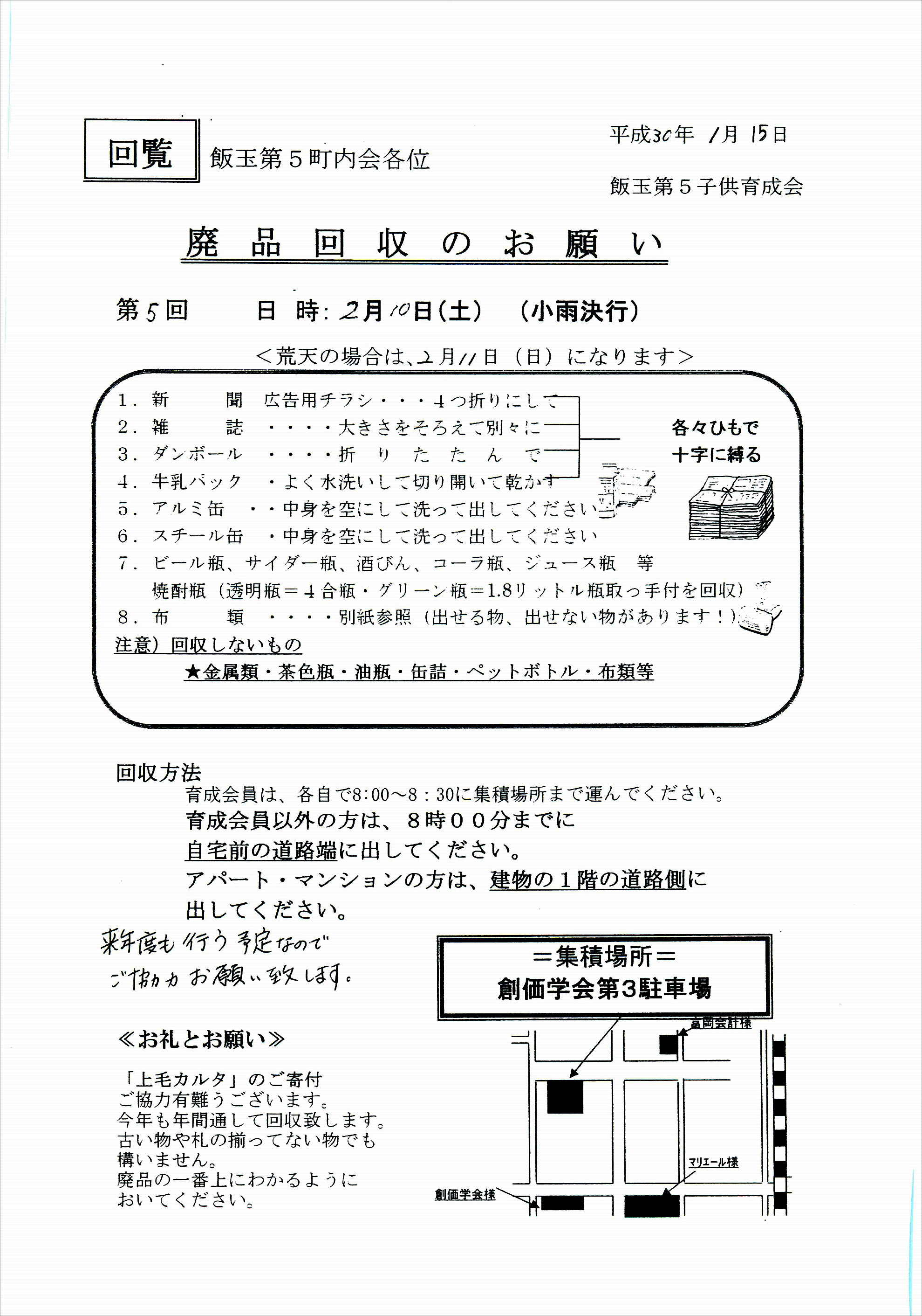 ・廃品回収を5月10日(土)に実施予定です。もし手が空いている町内の方がおりましたなら、お手伝いをよろしくお願いいたします。場所はマリエール様前の創価学会様の駐車場です。