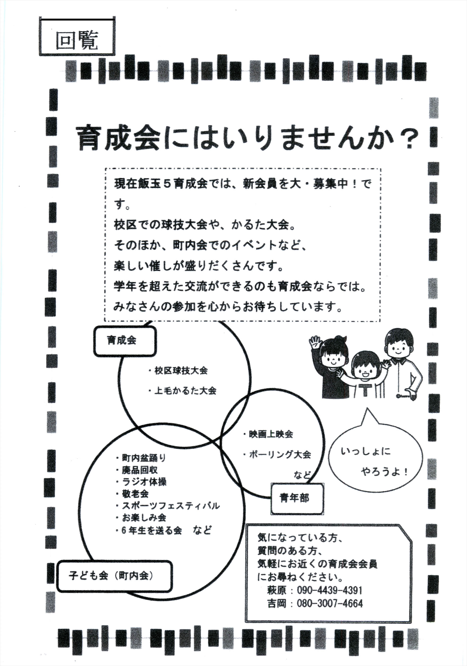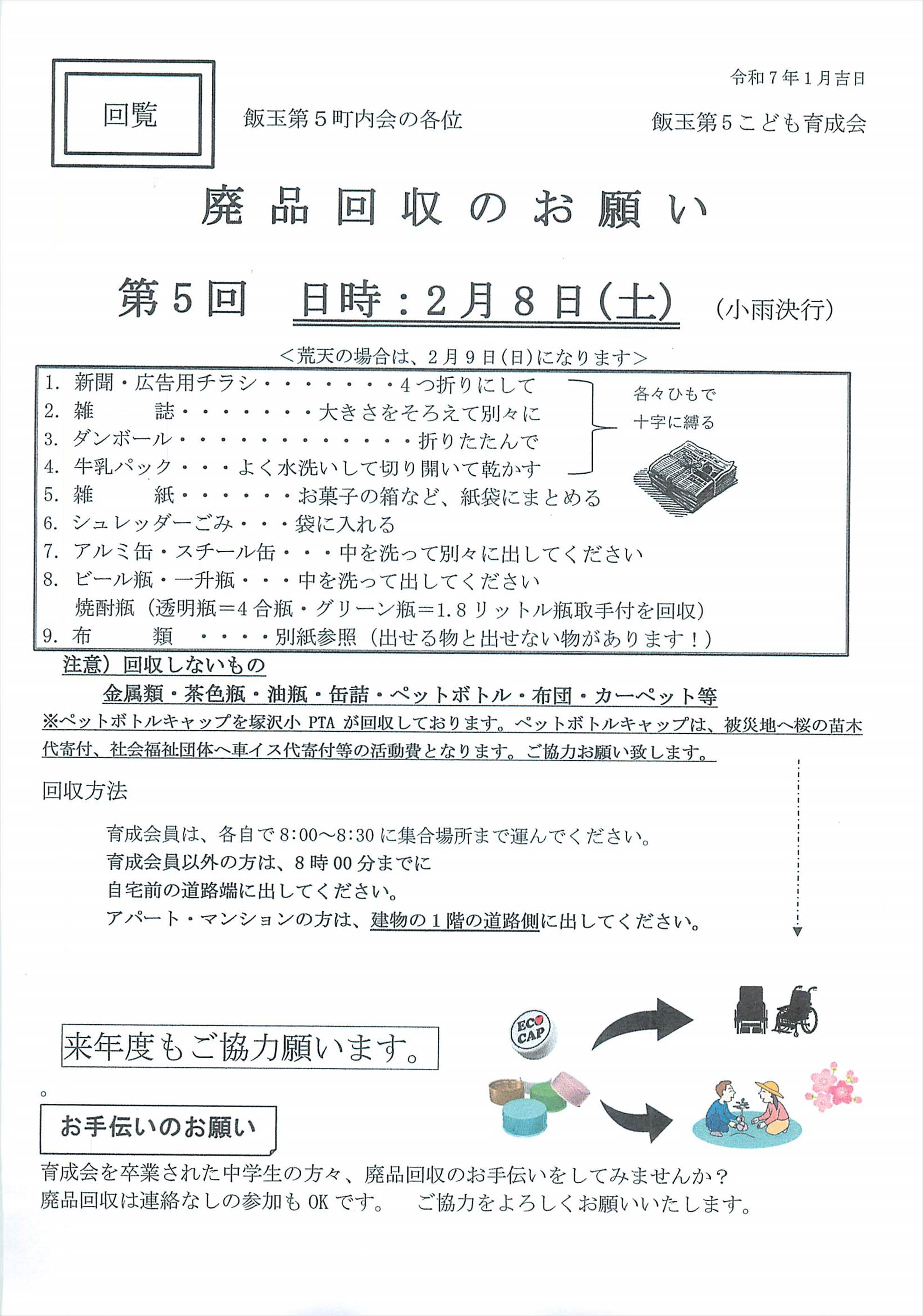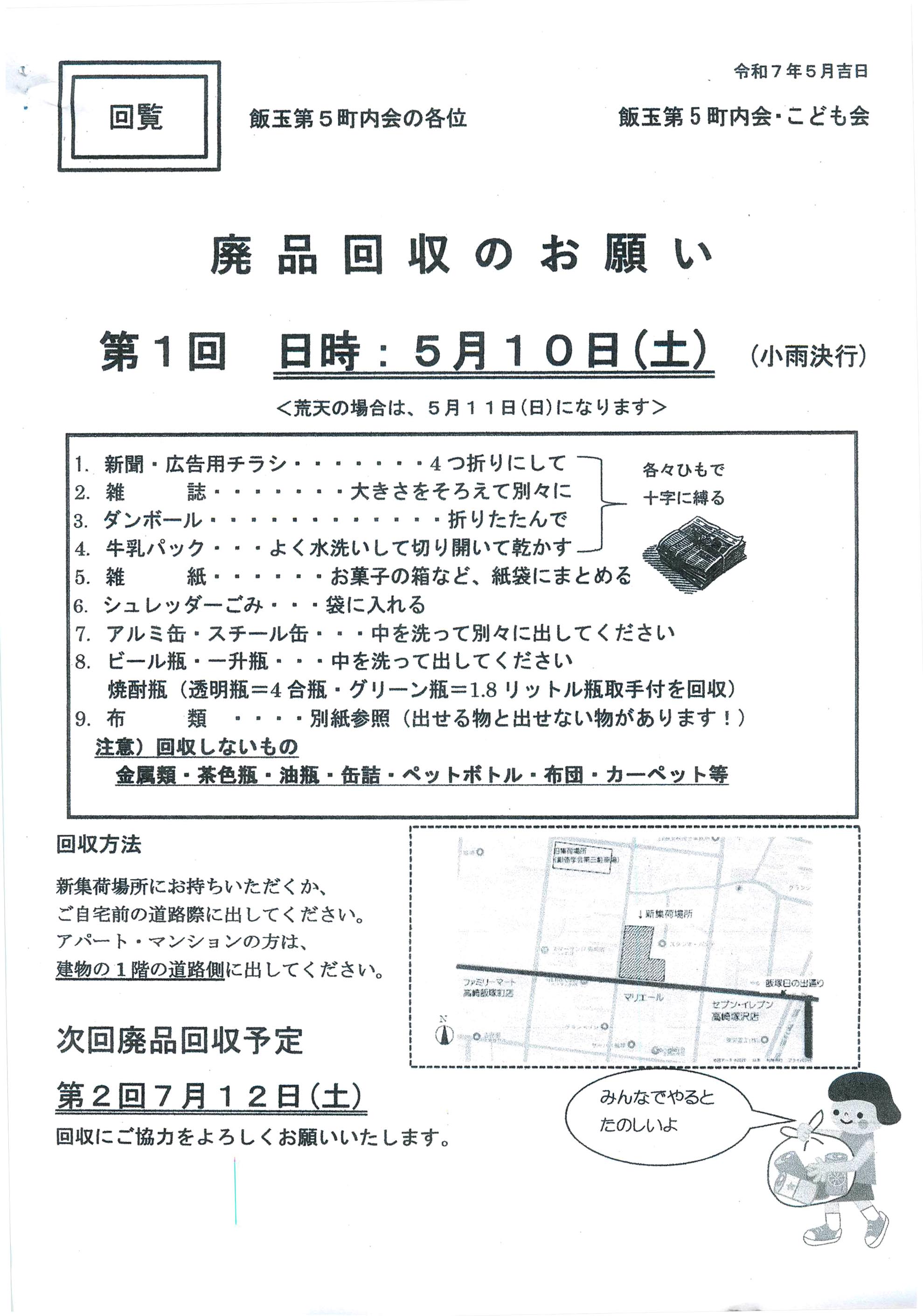 ・今月8日に飯玉第5こども育成会主催の「廃品回収」が実施されます。この廃品回収も人手が足らず、町内では大変苦労しております。もしお手伝いができる方がいらっしゃればぜひ右側の中村までご連絡下さい。よろしくお願い致します。