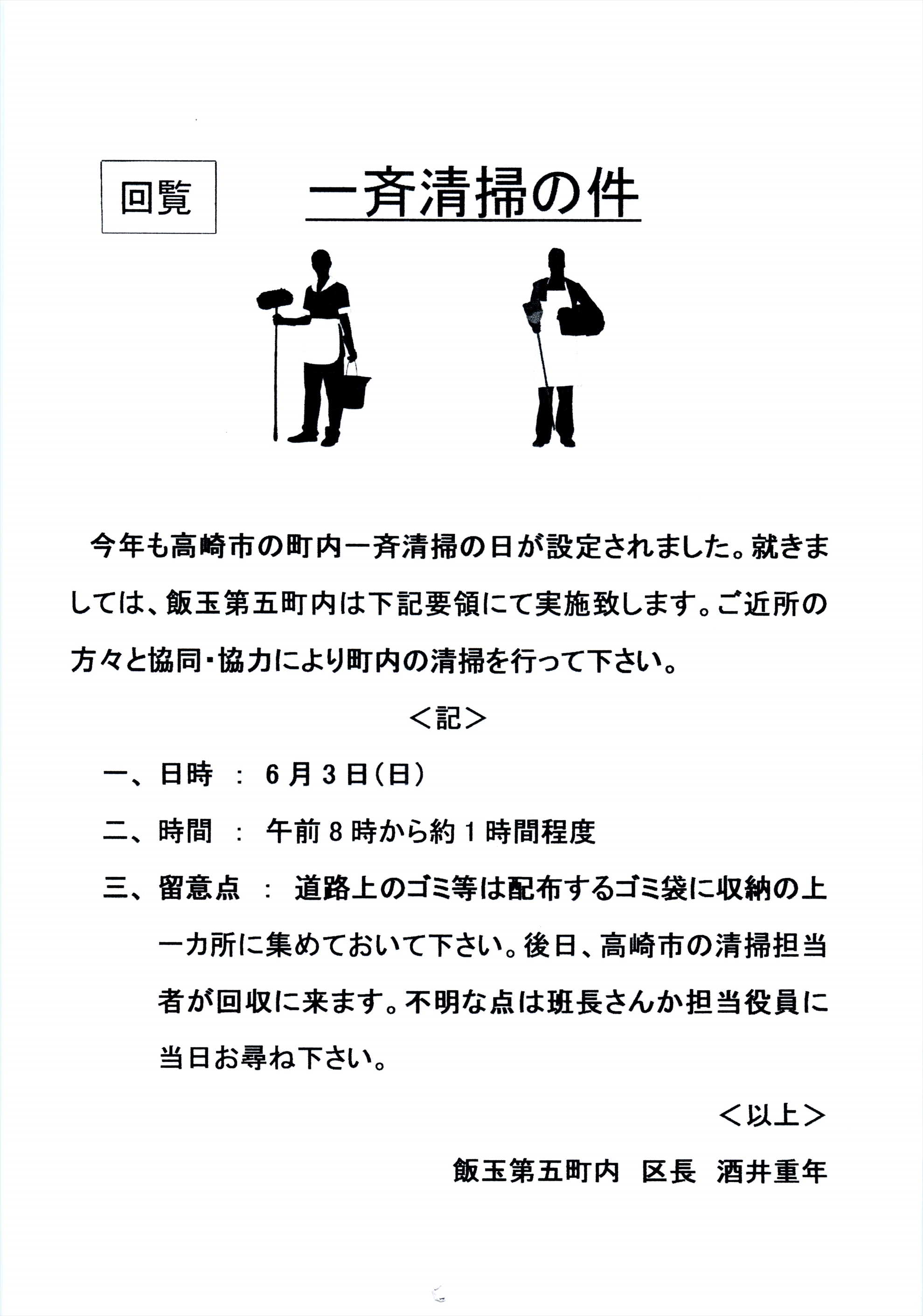・飯玉第5町内では6月1日(日)8時から町内一斉清掃を行う予定です。近々班長さんにゴミ袋を配布いたします。よろしくお願いいたします。
