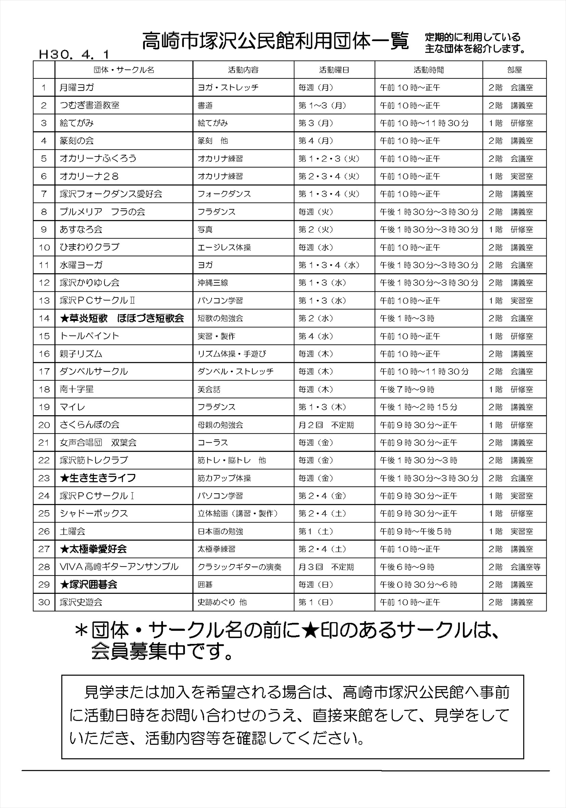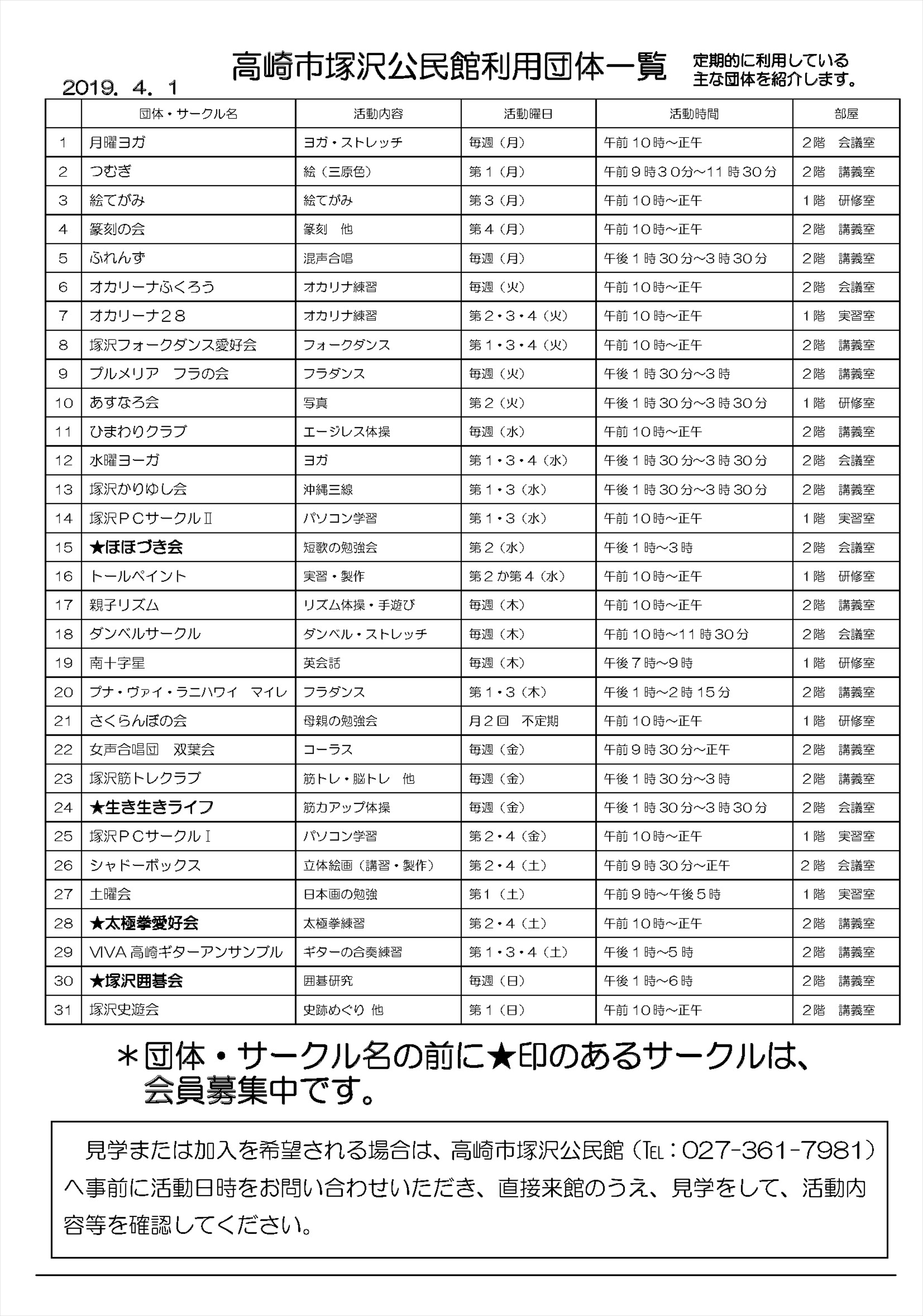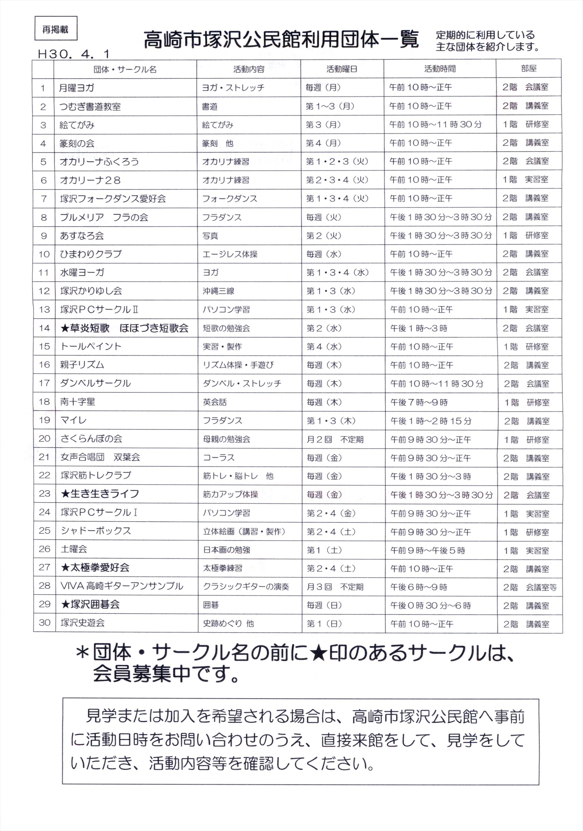 ・「塚沢公民館だより」で塚沢公民館を利用している団体がたくさんあるのにビックリしました。会員募集中の団体もありますので一見の価値はありそうです。