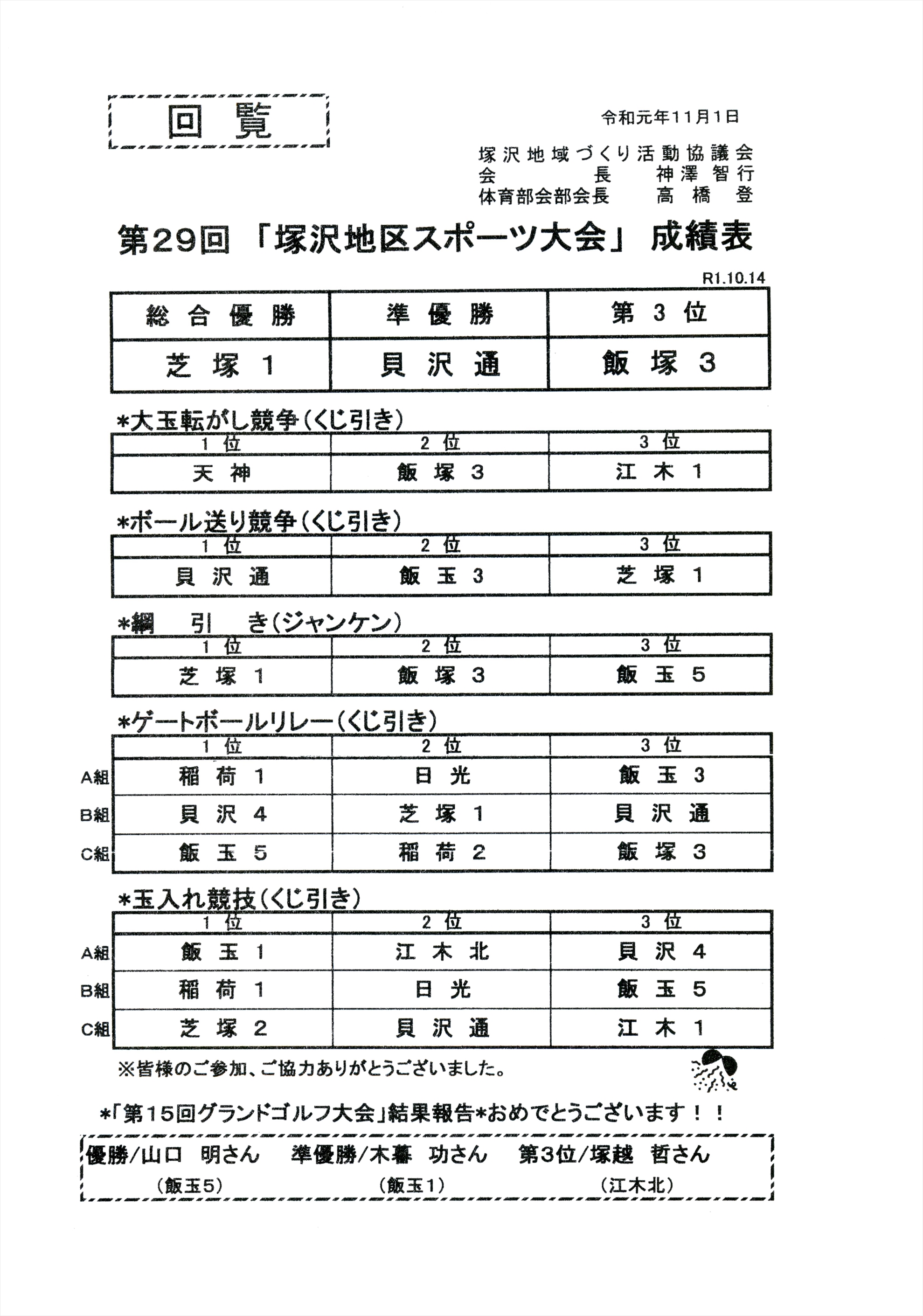 ☆10月9日 第26回「塚沢地区スポーツ大会」成績表
