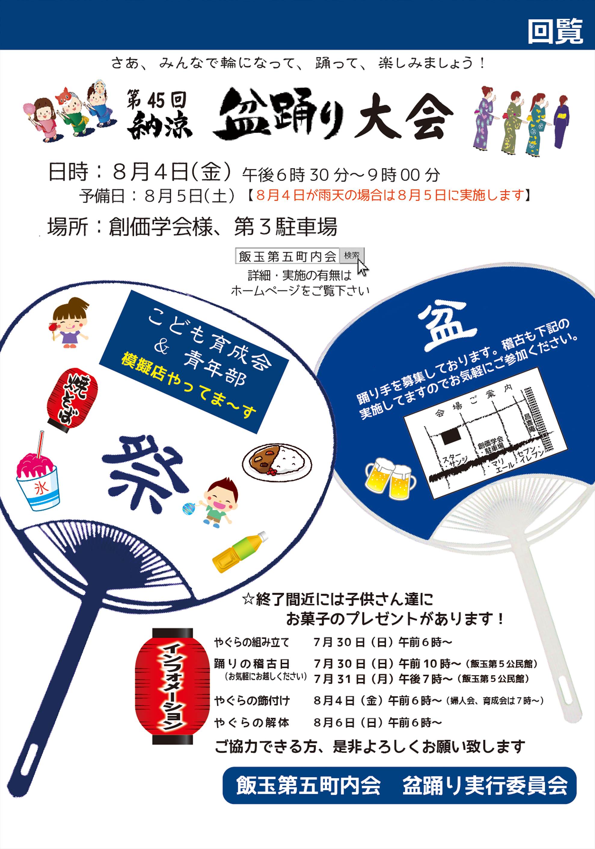 ・8月10日に「第45回飯玉第五町内会盆踊り大会」が行われます。今年は一日のみで雨が降ったら中止となります。また、8月4日(日)朝6時からやぐら建てを行います。お手伝いを手伝っていただける方を募集してますので、ぜひご協力をよろしくお願いいたします。また、もしも雨天のため中止の場合はこのホームページでもお知らせいたしますので、ご利用ください。