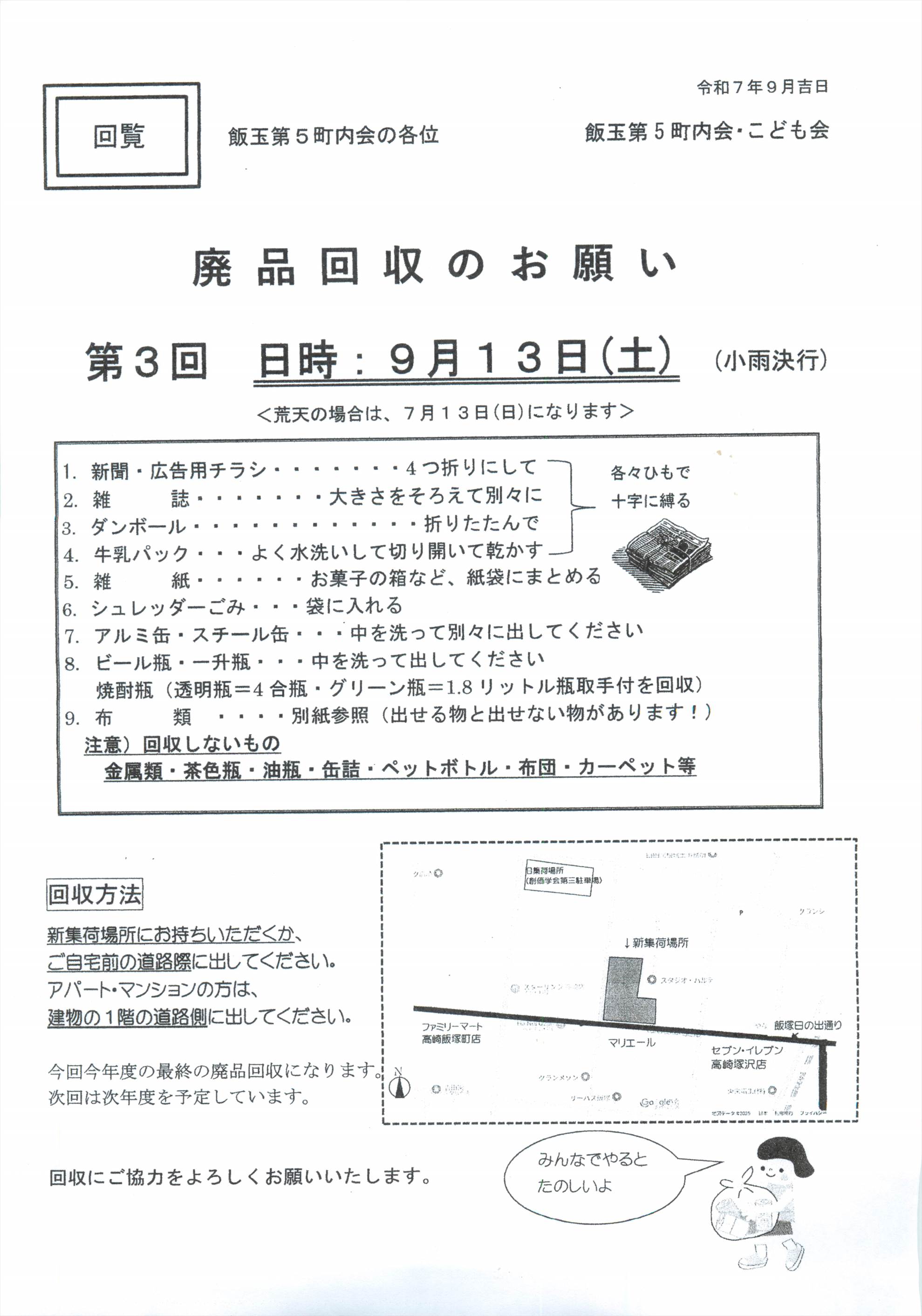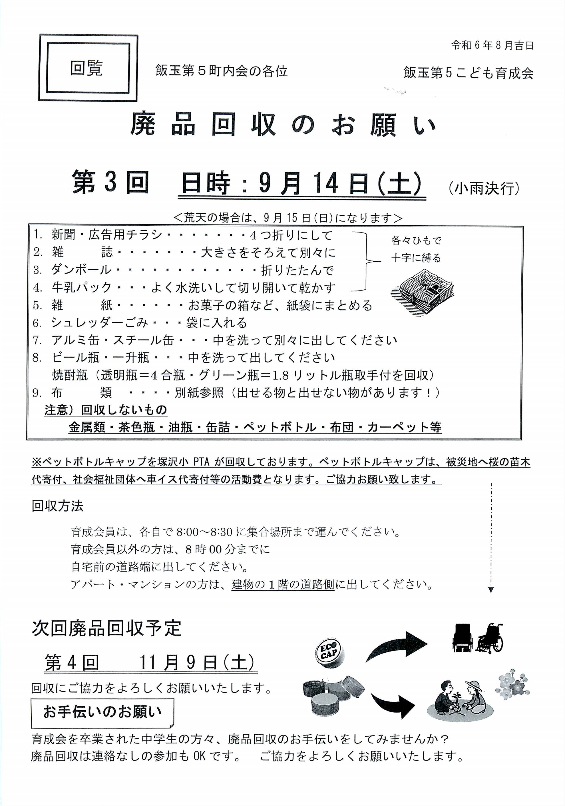 ・飯玉第五町内会の回覧板(9月1日)をアップ致しました。また、今月9月14日(土)には廃品回収がありますので、よろしくお願いいたします。