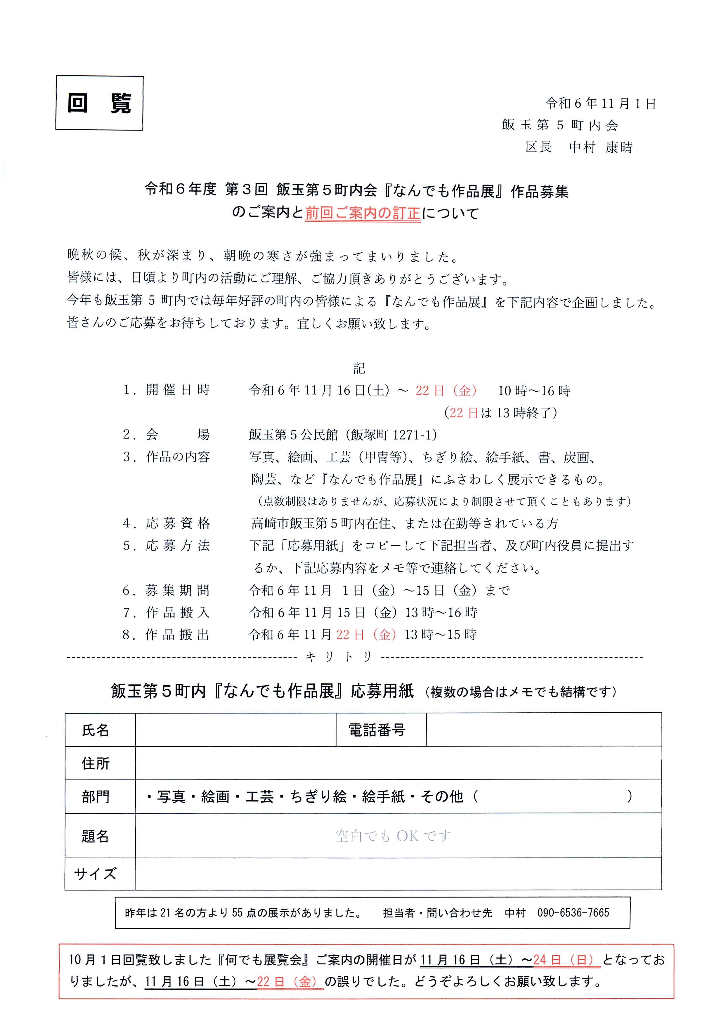 ・やっと、やっと、やっと、涼しくなってきましたが、皆さんお元気でしょうか? 飯玉第五町内では昨年に続き今年も11月16日(土)から22日(日)の7日間『なんでも作品展』を実施します。皆さん、ふるってご参加ください。